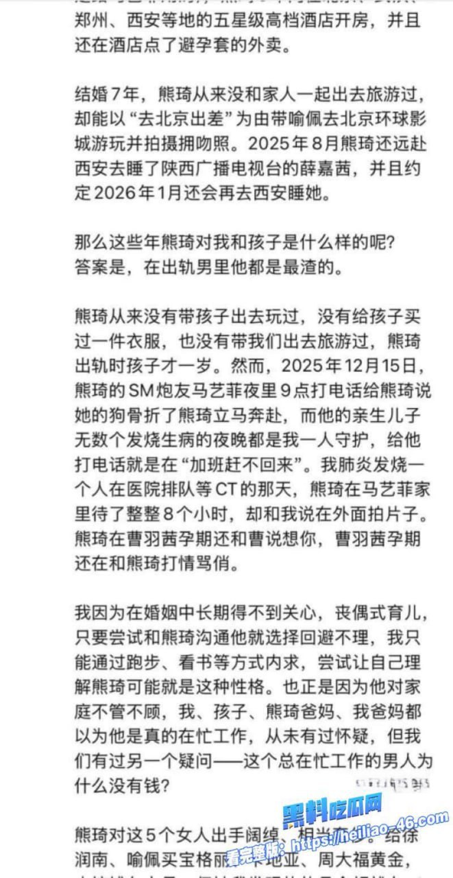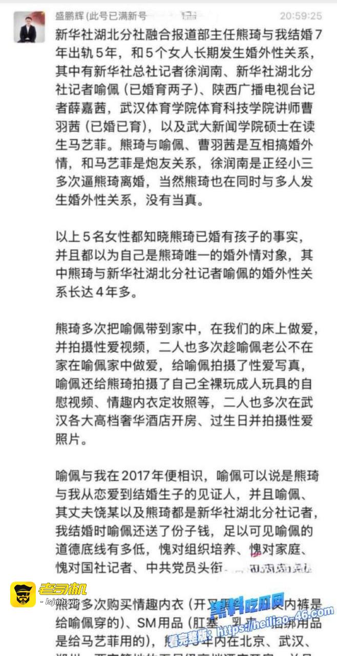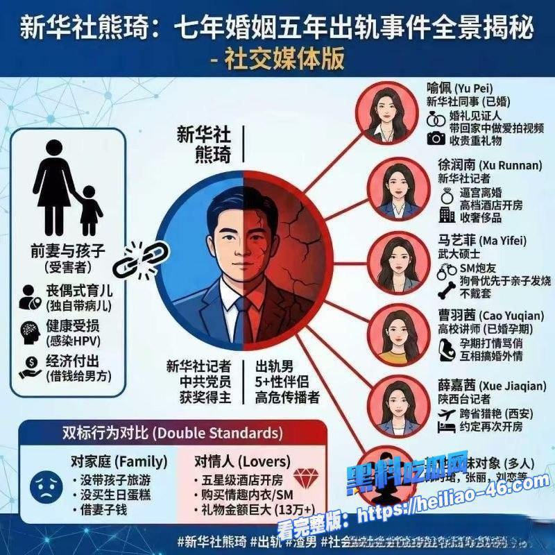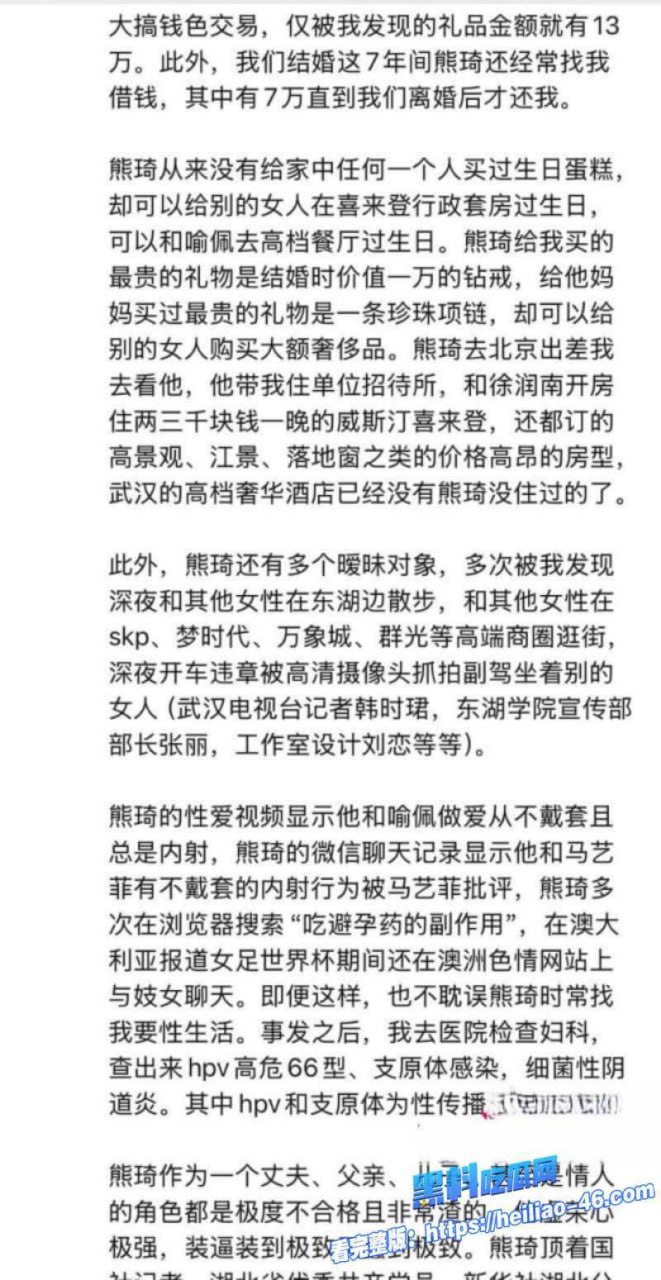 从总社记者徐润南逼婚小三,到分社喻佩夫妻卧室多次内射、孕期曹羽茜调情、武大马艺菲SM炮友、薛嘉茜西安睡……熊琦携带HPV高危病毒+支原体感染,将老婆和多名女性推向健康深渊,渣男本性发挥到极限,全网怒骂“人渣+惯犯+禽兽”,这波塌房太狠了!