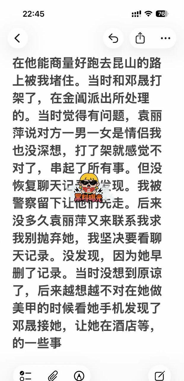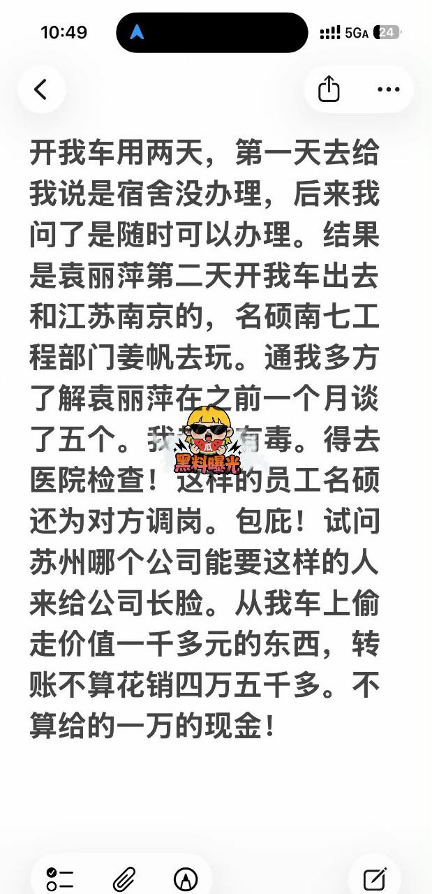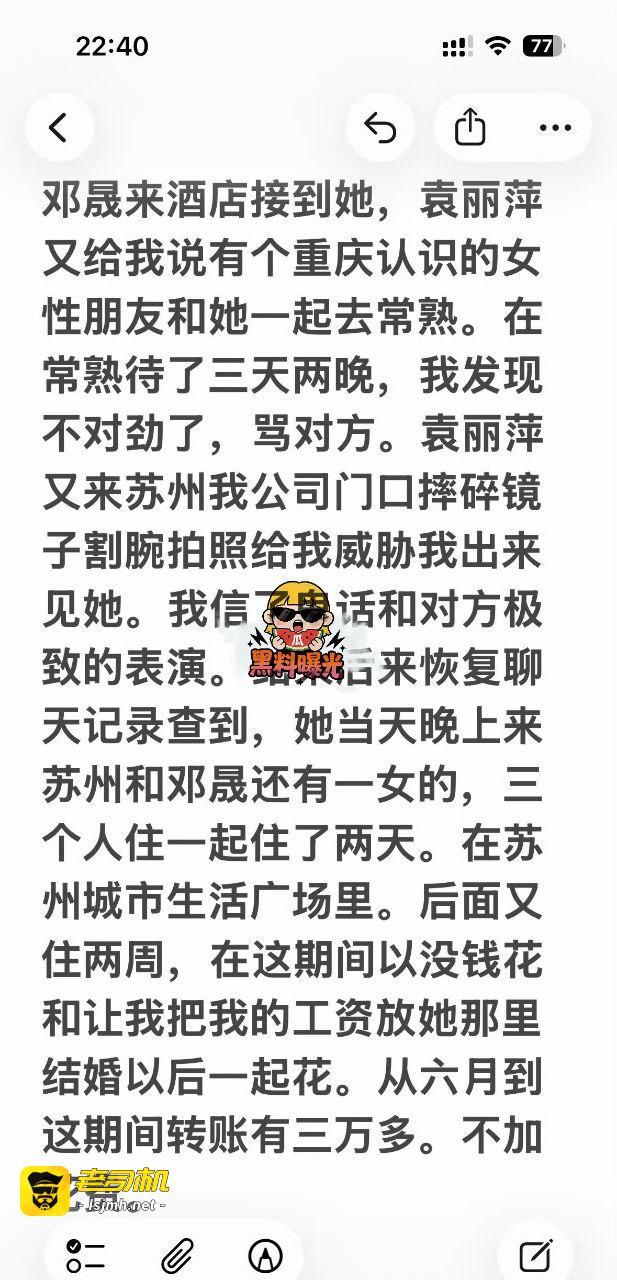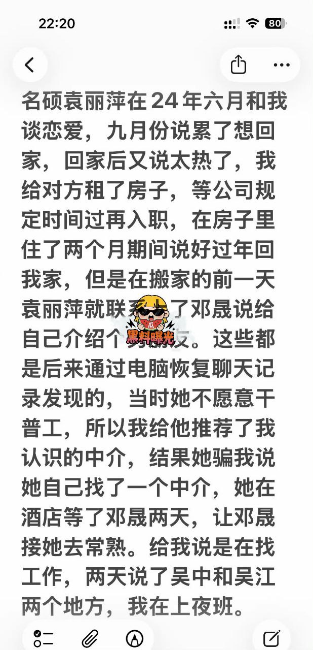 名硕袁丽萍在24年六月和我谈恋爱,九月份说累了想回家,回家后又说太热了,我给对方租了房子,等公司规定时间过再入职,在房子里住了两个月期间说好过年回我家,但是在搬家的前一天袁丽萍就联系上了邓晟说给自己介绍个男朋友。这些都是后来通过电脑恢复聊天记录发现的,当时她不愿意干普工,所以我给他推荐了我认识的中介,结果她骗我说她自己找了一个中介,她在酒店等了邓晟两天,让邓晟接她去常熟。给我说是在找工作,两天说了吴中和吴江两个地方,我在上夜班。邓晟来酒店接到她,袁丽萍又给我说有个重庆认识的女性朋友和她一起去常熟。在常熟待了三天两晚,我发现不对劲了,骂对方。袁丽萍又来苏州我公司门口摔碎镜子割腕拍照给我威胁我出来见她。我信了鬼话和对方极致的表演。结果后来恢复聊天记录查到,她当天晚上来苏州和邓晟还有一女的,三个人住一起住了两天。在苏州城市生活广场里。后面又住两周,在这期间以没钱花和让我把我的工资放她那里结婚以后一起花。从六月到这期间转账有三万多。不加花费。在他能商量好跑去昆山的路上被我堵住。当时和邓晟打架了,在金阊派出所处理的。当时觉得有问题,袁丽萍说对方一男一女是情侣我也没深想,打了架就感觉不对了,串起了所有事。但没恢复聊天记录没发现。我被警察留下让他们先走。后来没多久袁丽萍又来联系我求我别抛弃她,我坚决要看聊天记录。没发现,因为她早删了记录。当时没想到原谅了,后来越想越不对在她做美甲的时候看她手机发现了邓晟接她,让她在酒店等,的一些事但是这是没有恢复的。之后又给我保证以后不会再犯了。